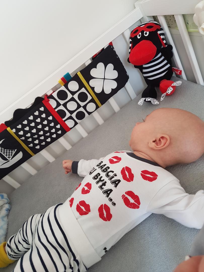 Mięciutka, materiałowa książeczka sensoryczna do łóżeczka od Mom’s care została stworzona z myślą o najmłodszych. To właśnie w pierwszym okresie życia dziecka kluczową rolę odgrywa stymulacja zmysłów. Wodzenie spojrzeniem i wpatrywanie się w zabawki rozwija zmysł wzroku oraz spostrzegawczość malucha. Do uszycia książeczek sensorycznych używamy bezpiecznych, przyjemnych w dotyku materiałów o różnej strukturze, które z pewnością zaciekawią badawcze paluszki. Dzięki temu dziecko poznaje świat i stymuluje zmysł dotyku. Noworodek ma słaby wzrok, dlatego czarno-biała książeczka sensoryczna z dodatkiem czerwonego, będzie dla niego idealna. Przewaga biało-czarnych elementów rozwija prawidłowe postrzeganie barw. Wraz z upływem czasu dziecko widzi coraz lepiej, więc można sięgać po zabawki w innych kontrastujących kolorach. Książeczka pełna jest niespodzianek. Liczne elementy interaktywne takie jak szeleszczące strony, metki, geometryczne wzory, z pewnością zapewnią dziecku wspaniałą zabawę na długi czas dodatkowo stymulując jego zmysły. Kontrastowa książeczka wyposażona jest w dodatkowe sznureczki, które pozwalają na przymocowanie zabawki do łóżeczka lub wózka. W trosce o bezpieczeństwo Waszych pociech dostosowaliśmy rozmiar książeczki tak by pasowała do łóżeczka i dzięki temu chroniła malucha przed uderzeniem o szczebelki.